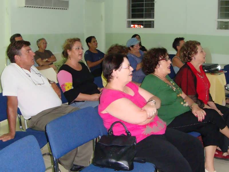 שגיא מילמן על הקלידים. במפגש הפעם, בנוסף לתזמורת החייה (גיטרה וקלידים), גם השמענו חלק מהביצועים המקוריים ושרנו יחד איתם בליווי שקופיות.